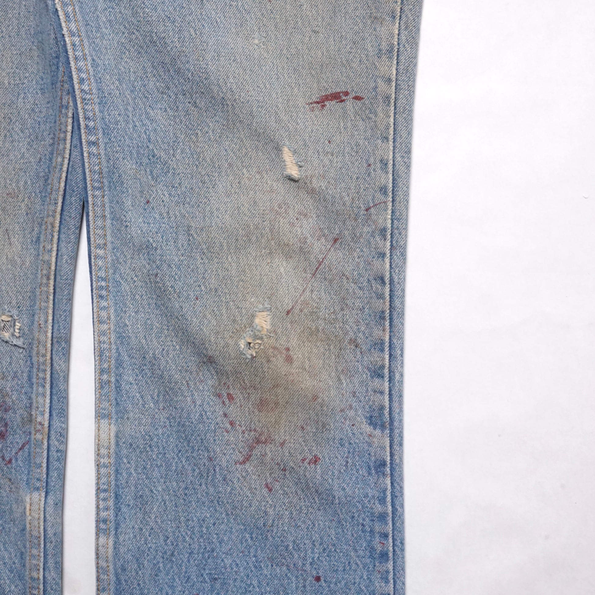 details: slim boot cut, paint splatter, made in usa.